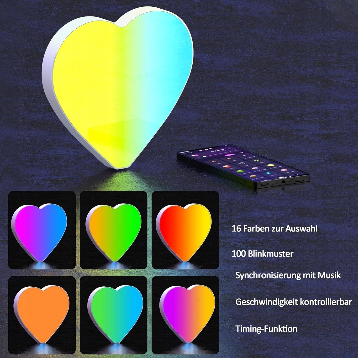 Inteligentna aplikacja i majsterkowanie: lampki LED w kształcie serca można swobodnie sterować za pomocą inteligentnej aplikacji lub przełącznika przyciskowego, oferując setki różnych kolorów światła i efektów rytmicznych. Światła LED są kolorowe, trwałe i można je ściemniać. Każde światło w kształcie serca jest dostarczane z pięcioma naklejkami w różnych wzorach, które można dowolnie naklejać. Można również kupić kilka lampek w kształcie serca i połączyć je ze sobą, aby stworzyć wyjątkową zmianę kolorów i kombinacje, które uzupełniają ciepłą atmosferę w pomieszczeniu. Ta lampka nocna jest wyposażona w funkcję timera, dzięki której można ustawić czas włączania i wyłączania.